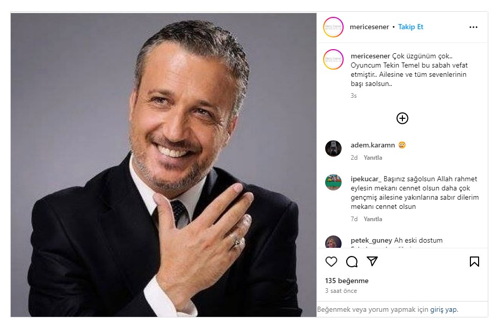 Esener, "Çok üzgünüm çok.. Oyuncum Tekin Temel bu sabah vefat etmiştir.. Ailesine ve tüm sevenlerinin başı saolsun.." ifadelerini kullandı.