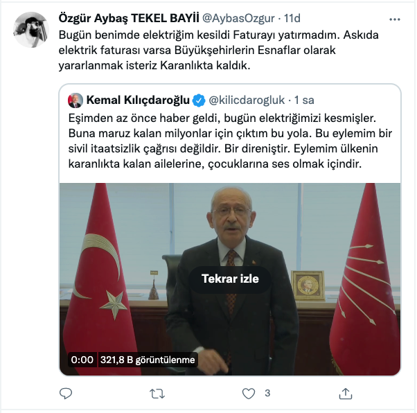 Zamlar geri alınana kadar faturasını ödemeyeceğini söyleyen CHP lideri Kemal Kılıçdaroğlu, evinin elektriklerinin kesildiğini açıkladı.Türkiye Tekel Bayileri Platformu Başkanı Özgür Aybaş, Kılıçdaroğlu'nun videosunu alıntılayarak, "Bugün benim de elektriğim kesildi, karanlıkta kaldık" paylaşımını yaptı.
