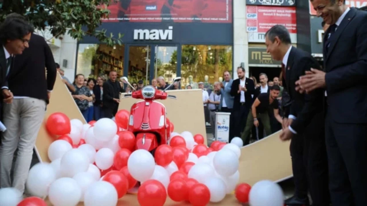 Kırmızı Vespa’ya 20 BN 919 plakasının takılı olduğu görüldü. Plakanın üstünde ise ‘Sayın Genel Başkanım Özgür Özel sağ olsun” yazısı dikkat çekti.
