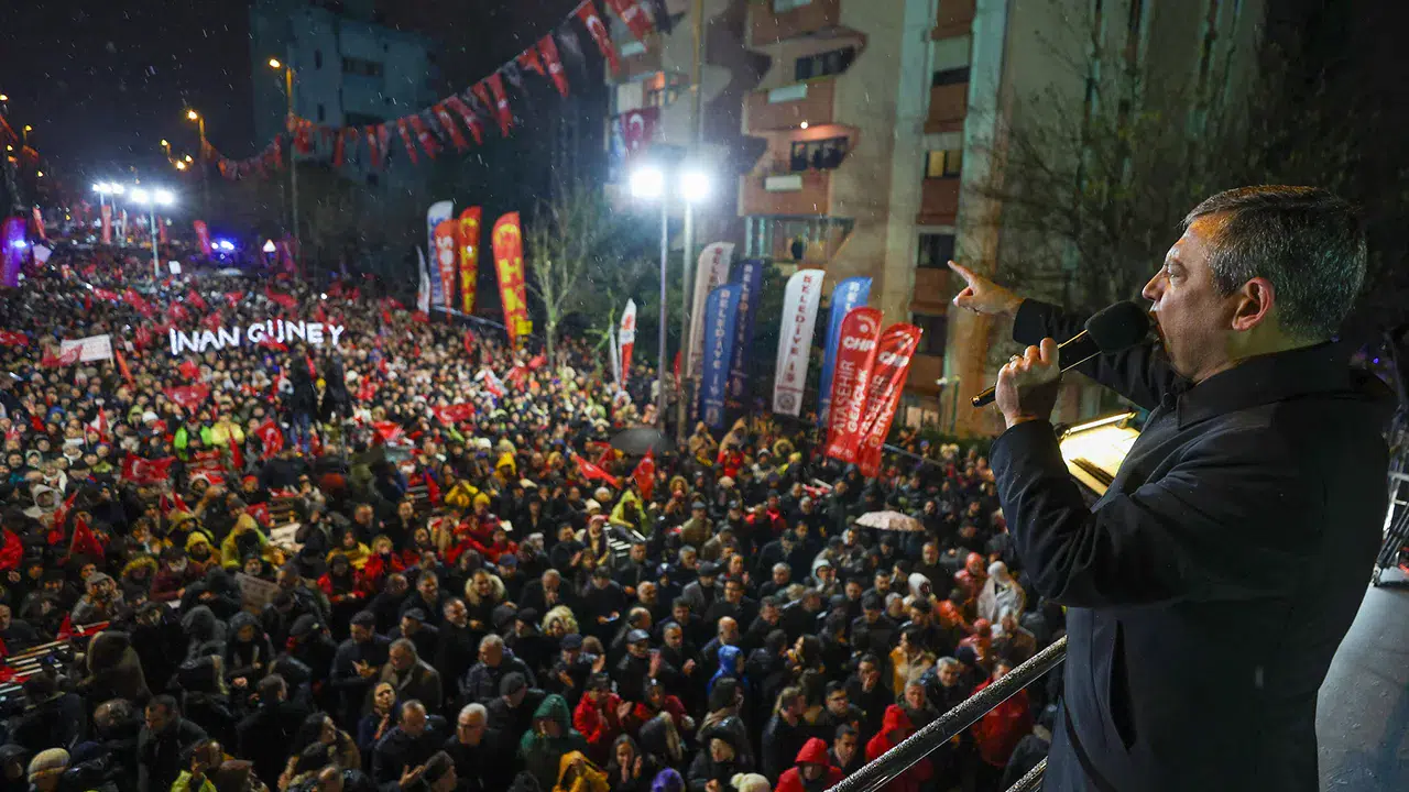 Kar yağışı altında konuşan Özel, mitinge yoğun katılım olduğuna vurgu yaparak, siyasi iktidara yönelik eleştirilerini sürdürdü. Özel, “Bugün sizin Cumhurbaşkanı adayınız Silivri’dedir ama morali 7 kat yukarıdadır. Onu içeri atan darbeci bir saraydadır ama yerin 7 kat dibindedir” ifadelerini kullandı.