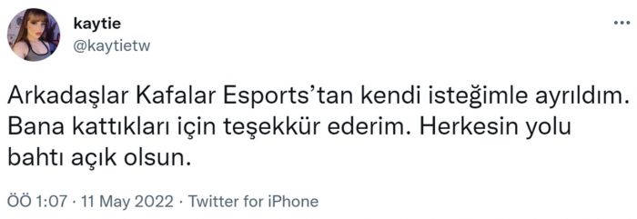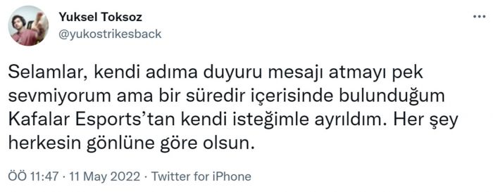 Kafalar Esports ekibinde yer alan Yüksel Toksöz ve Kübra Turhan, Twitter’dan yaptıkları paylaşımlarda Kafalar Esports ekibinden kendi istekleriyle ayrıldıklarını açıkladı. Her iki isim de ekibin geri kalanı için iyi dileklerini diledi. Sosyal medyada paylaşımları görenlerse ekipten ayrılanları destekledi.