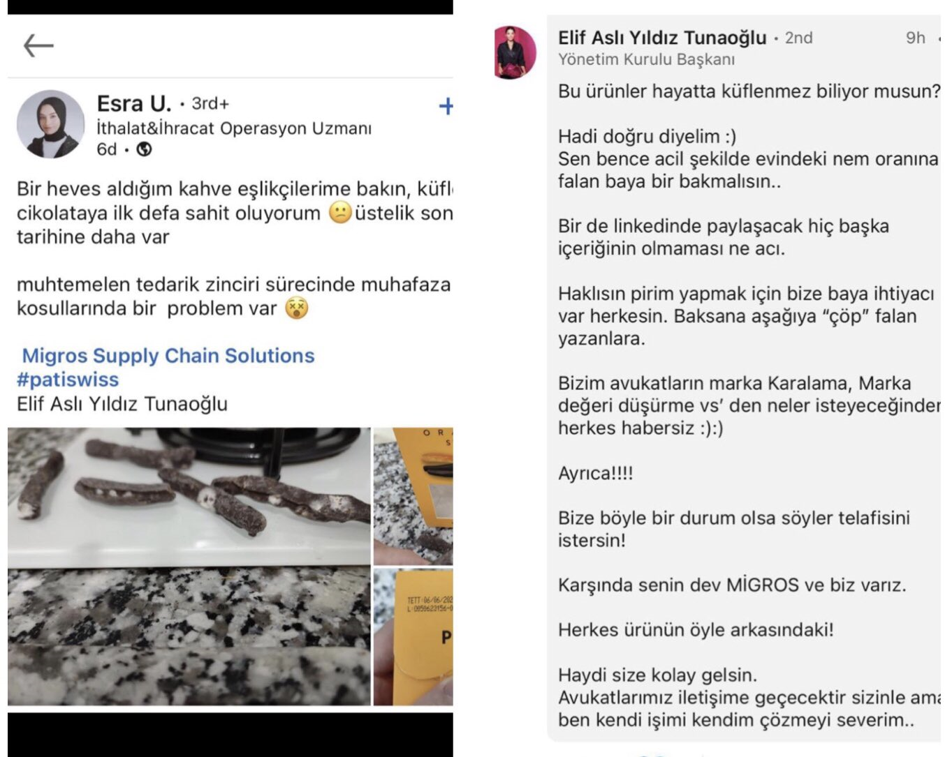 Çikolata üreticisi Patiswiss firmasının CEO'su Elif Aslı Yıldız Tunaoğlu, aldığı ürün küflü çıkan bir müşteri şikayetini sosyal medyada dile getirince önce müşteriyle dalga geçti, ardından tehdit etti. Sosyal medyada büyük tepki yükselince vatandaşı tehdit eden CEO paylaşımını sildi.
