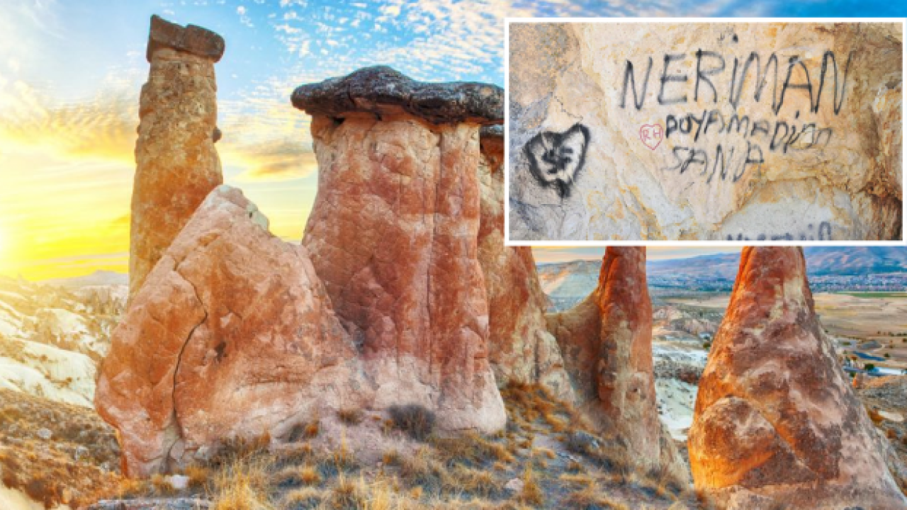 Türkiye'de en çok ziyaret edilen yerlerden olan Kapadokya'daki peri bacaları, sprey boyalar ile yazılar yazılarak tahrip edildi.