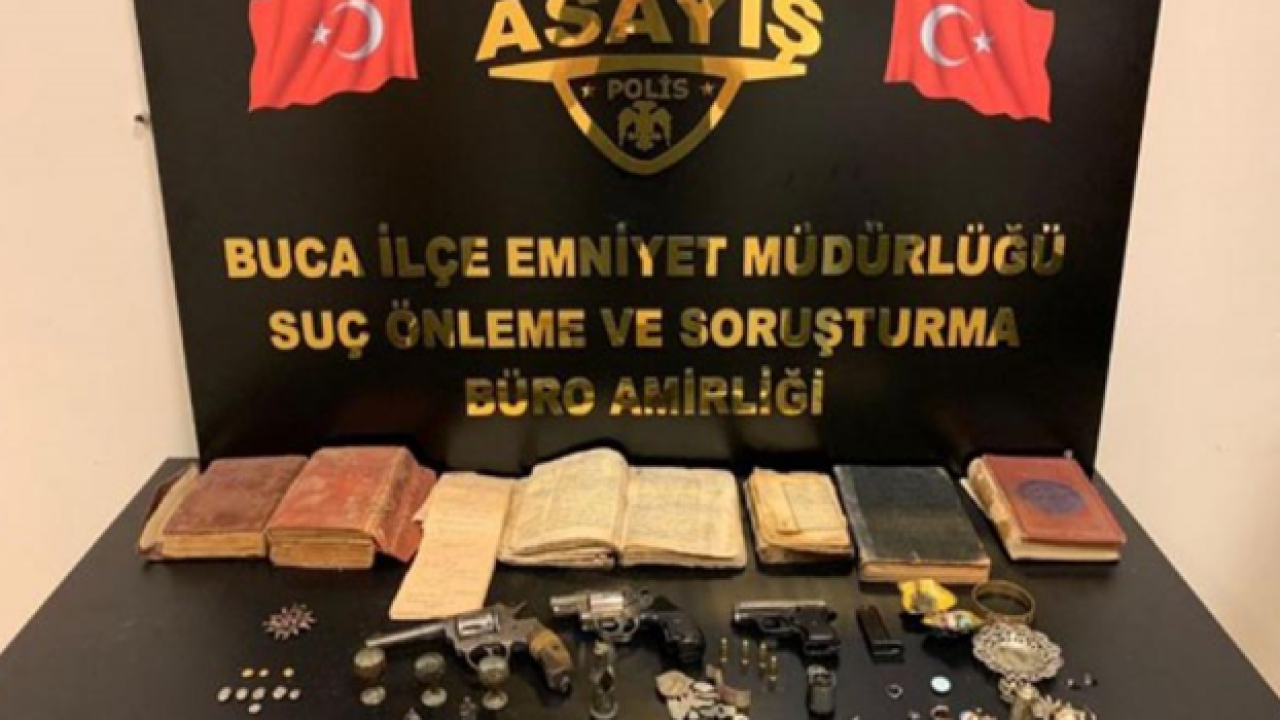 İzmir Buca'da polisin durduğu takside bir kadının çantasından 3 tabanca, 1 Kore madalyası ve tarihi eser niteliği taşıdığı değerlendirilen 95 obje ele geçirildi.