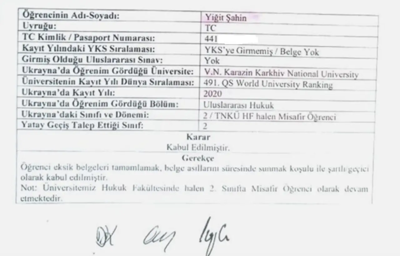 2022 yılında başlayan Rusya-Ukrayna savaşı sonrası YÖK, bu ülkedeki öğrenciler için özel öğrenci statüsü ve yatay geçiş hakkı tanıdı. Yiğit Şahin, bu kez Karazin Kharkiv Üniversitesi’nin Uluslararası Hukuk Bölümü öğrencisi olarak kayıt yaptırdı. Resmî belgelerde 2020 yılında bu üniversiteye kaydolduğu belirtildi. TNKÜ'nün yatay geçiş belgesine göre Şahin’in YKS’ye ya da uluslararası bir sınava girmediği kayıtlarda yer aldı.
