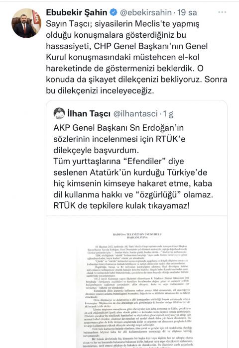 RTÜK Başkanı Ebubekir Şahin, sosyal medya hesabından yaptığı paylaşımda, Kurul Üyesi İlhan Taşcı'ya ithafen "Siyasilerin Meclis'te yapmış olduğu konuşmalara gösterdiğiniz bu hassasiyeti, CHP Genel Başkanı'nın Genel Kurul konuşmasındaki müstehcen el-kol hareketinde de göstermenizi beklerdik. O konuda da şikayet dilekçenizi bekliyoruz. Sonra bu dilekçenizi inceleyeceğiz" yanıtını verdi.