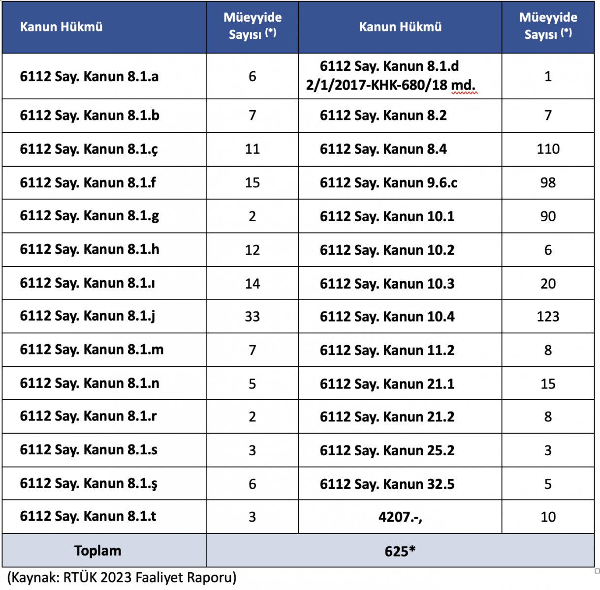 ''6112 sayılı Kanun’un, ‘Yayın Hizmeti İlkeleri’ başlıklı 8’inci maddesi, ‘Genel Esaslar’ başlıklı 9’uncu maddesi, ‘Televizyon ve Radyo Yayın Hizmetlerinde Reklam ve Tele-Alışveriş’ başlıklı 10’uncu maddesi, ‘Belirli Ürünlerin Ticarî İletişimi’ başlıklı 11’inci maddesi, ‘Program Desteklemesi’ başlıklı 12’nci maddesi, ‘Ürün Yerleştirme’ başlıklı 13’üncü maddesi, ‘Kamunun Önemli Olaylara Erişimi’ başlıklı 17’nci maddesi, ‘Logo ve Çağrı İşareti’ başlıklı 21’inci maddesi, ‘Koruyucu Sembol’ sistemi başlıklı 24’üncü maddesi ve ‘Yayın Kayıtlarının Muhafazası’ başlıklı 25’inci maddesi ihlallerinden dolayı; 49 adet medya hizmet sağlayıcı kuruluşa 358 adet müeyyide tutarı olarak 77 milyon 692 bin 761 TL, 6112 sayılı Kanun’un ‘Gelirlerin Tahsili’ başlıklı 42/4 ve 42/5 maddelerinin ihlallerinden dolayı; 158 adet medya hizmet sağlayıcı kuruluşa 343 adet müeyyide tutarı olarak 3 milyon 514 bin 877,50 TL, 4207 ve 4250 sayılı Kanunlara muhalefetten dolayı ise; 2 adet medya hizmet sağlayıcı kuruluşa 10 adet müeyyide tutarı olarak 694 bin 110 TL, olmak üzere toplam 81 milyon 901 bin 748,50 TL idari para cezası uygulanmıştır.''