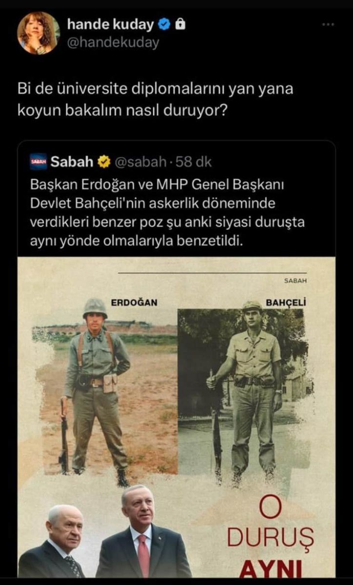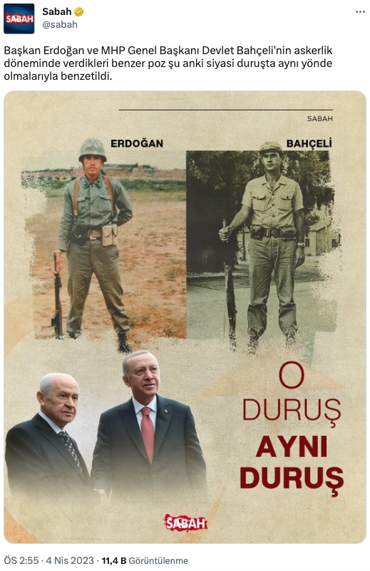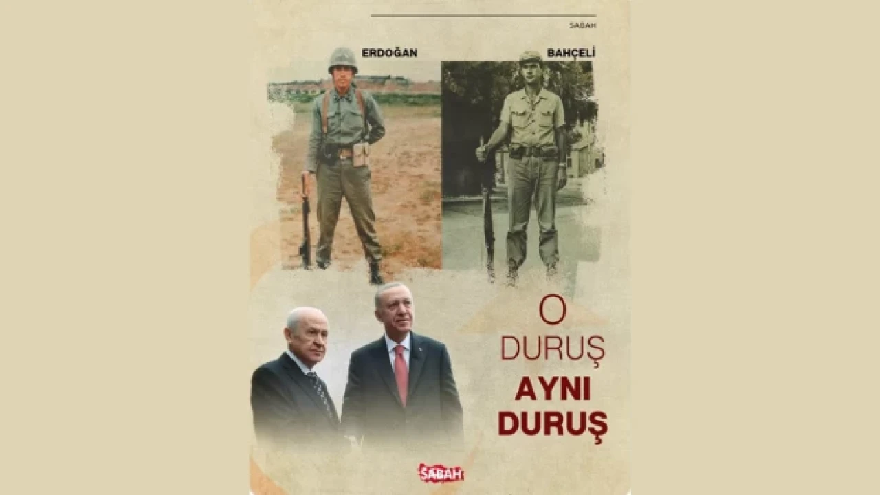 Sabah gazetesinin Twitter hesabında, cumhur ittifakı ortakları Erdoğan ve Bahçeli’nin askerlik döneminde çektirdiği fotoğraflar ve şimdiki hallerinin bulunduğu bir kolaja yer verildi.