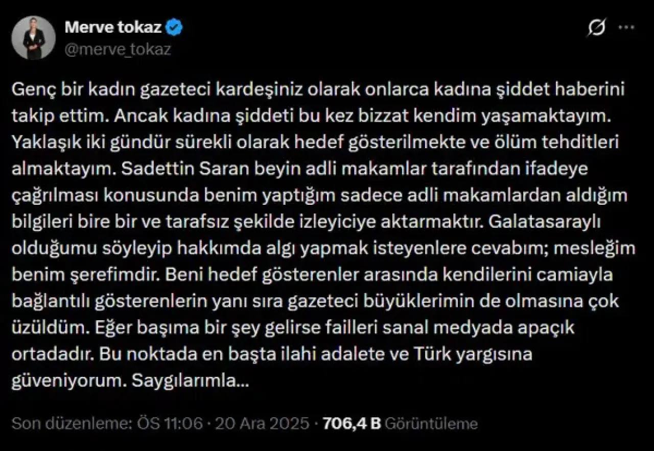 Fenerbahçe Spor Kulübü Başkanı Sadettin Saran’ın uyuşturucu soruşturması kapsamında ifadeye çağrılmasını kamuoyuna duyuran CNN Türk muhabiri Merve Tokaz, yaptığı haber nedeniyle hedef gösterildiğini ve ölüm tehditleri aldığını açıkladı. Tokaz, sosyal medya üzerinden yaptığı paylaşımda can güvenliğinin olmadığını belirterek, tehditlerin faillerinin açıkça ortada olduğunu vurguladı.