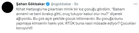 Şahan Gökbakar, Nihat Hatipoğlu'nda ağlayarak sorduğu soruyla gündeme gelen 8 yaşındaki kızın görüntüsünün ekrana verilmesine tepki göstererek, "Bu çok açık şekilde çocuk istismarıdır. Bu çocuğa bunu yapmaya kimsenin hakkı yok. RTÜK buna nasıl müsaade ediyor?" ifadelerini kullandı.