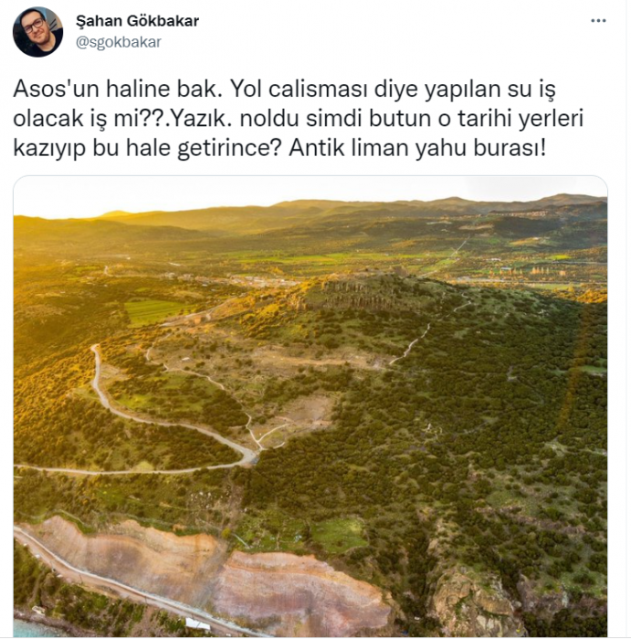 Sosyal medyada antik kente sokulan iş makinelerine karşı #AssostaKatliamVar hashtagi ile tepki gösterildi. Şahan Gökbakar da tepki gösterenler arasında yer aldı.