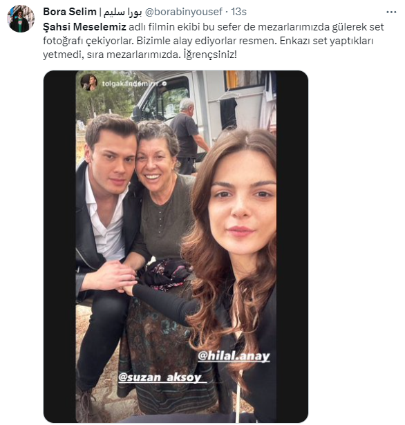 X hesabından yapılan bir paylaşımda, “Şahsi Meselemiz adlı filmin ekibi bu sefer de mezarlarımızda gülerek set fotoğrafı çekiyorlar. Bizimle alay ediyorlar resmen. Enkazı set yaptıkları yetmedi, sıra mezarlarımızda. İğrençsiniz!” ifadeleri kullanıldı.