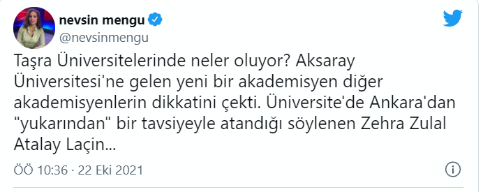 Taşra Üniversitelerinde neler oluyor? Aksaray Üniversitesi'ne gelen yeni bir akademisyen diğer akademisyenlerin dikkatini çekti. Üniversite'de Ankara'dan "yukarından" bir tavsiyeyle atandığı söylenen Zehra Zulal Atalay Laçin...