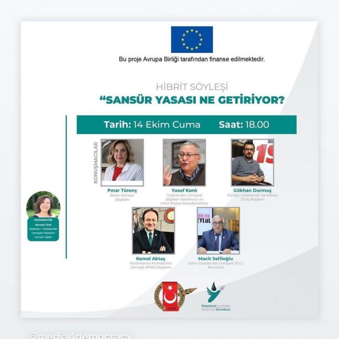Gazeteciler Cemiyeti’nin Avrupa Birliği finansmanıyla yürüttüğü Demokrasi için Medya/Medya için Demokrasi (M4D) Projesi kapsamında düzenlenen hibrit söyleşide gazeteciler bir araya geliyor. Gazetecilerin sansür yasasını değerlendireceği "Sansür yasası ne getiriyor?" konulu söyleşi 14 Ekim saat 18.00'de Nursun Erel Moderatörlüğünde gerçekleşecek.
