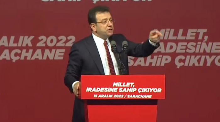 Yüzyıl önce olduğu gibi bugün de egemenlik kayıtsız şartsız milletindir diyenler burada. Saraçhane'de. Ama o yüzyıl önce verilen o kararın, o ilkenin, o iradenin temsilcileri, kadınlar, erkekler, gençler, yaşlılar burada. İstanbul'dan egemenlik kayıtsız şartsız milletindir diye haykıranların o sesini duymayanların, onların saraylara kapandığı anda milletin sesini duymadığı anda biz Saraçhane'deyiz. Bir tiyatroya, bir haksızlığa, siyah cübbelerini saranlara buradan seslenen İstanbullular, diyorsunuz ki 'Saray sizinse Saraçhane bizimdir.' Zulüm sizinse, sandık bizimdir diyorsunuz. 16 milyon İstanbullunun iradesi burada. Demokrasi burada, irade burada, Ekrem kardeşimin yanında. Gençler diyor ki yaşasın hürriyet, kahrolsun istibdat!