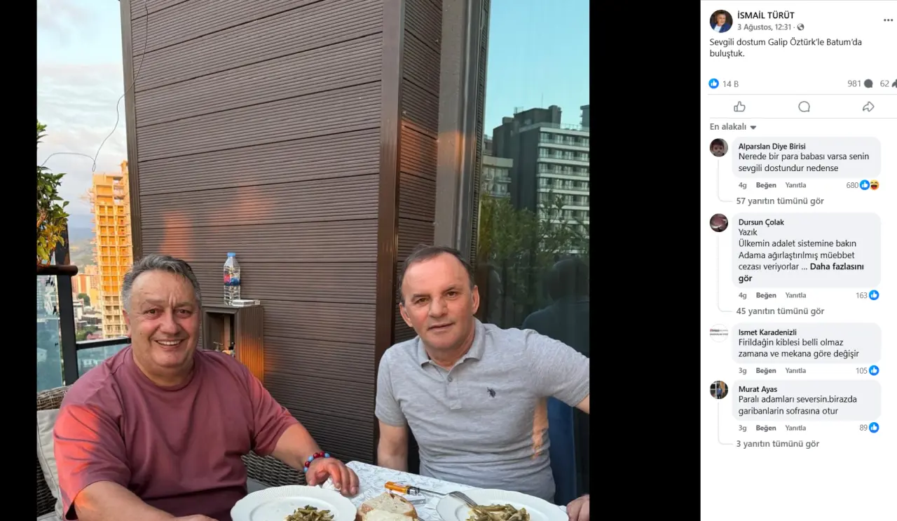 Şarkıcı İsmail Türüt, Türkiye’de hakkında kesinleşmiş müebbet hapis cezası olduğu için Gürcistan’a kaçan Metro Turizm’in sahibi Galip Öztürk’le fotoğraf paylaştı. Türüt, paylaşımında, "Sevgili dostum Galip Öztürk’le Batum’da buluştuk." ifadesine yer verdi.
