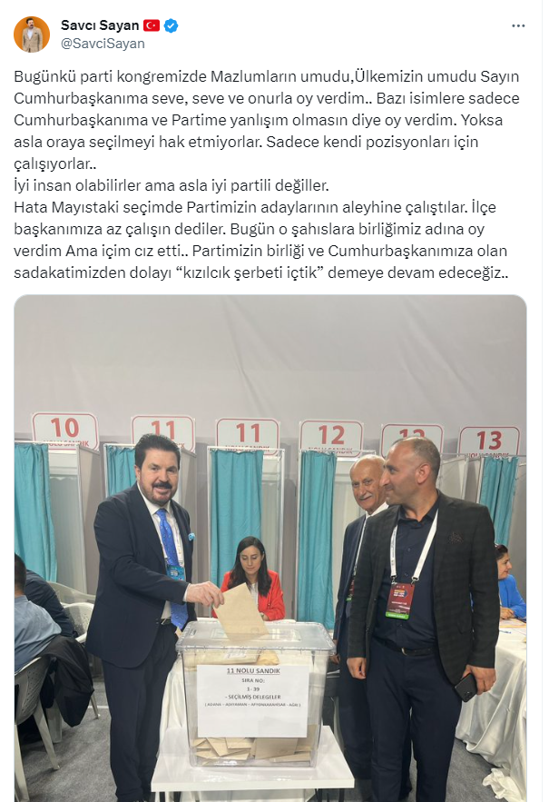 "Bugünkü parti kongremizde Mazlumların umudu,Ülkemizin umudu Sayın Cumhurbaşkanıma seve, seve ve onurla oy verdim.. Bazı isimlere sadece Cumhurbaşkanıma ve Partime yanlışım olmasın diye oy verdim. Yoksa asla oraya seçilmeyi hak etmiyorlar. Sadece kendi pozisyonları için çalışıyorlar.. İyi insan olabilirler ama asla iyi partili değiller. Hata Mayıstaki seçimde Partimizin adaylarının aleyhine çalıştılar. İlçe başkanımıza az çalışın dediler. Bugün o şahıslara birliğimiz adına oy verdim ama içim cız etti.. Partimizin birliği ve Cumhurbaşkanımıza olan sadakatimizden dolayı “kızılcık şerbeti içtik” demeye devam edeceğiz.."