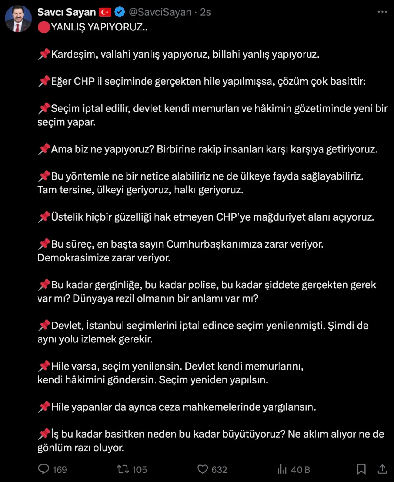 “Eğer CHP il seçiminde gerçekten hile yapılmışsa, çözüm çok basittir: seçim iptal edilir, devlet kendi memurları ve hâkimin gözetiminde yeniden seçim yapar. Ama biz ne yapıyoruz? Birbirine rakip insanları karşı karşıya getiriyoruz. Bu yöntemle ne bir netice alabiliriz ne de ülkeye fayda sağlayabiliriz. Üstelik hiçbir güzelliği hak etmeyen CHP’ye mağduriyet alanı açıyoruz. Bu süreç, en başta sayın Cumhurbaşkanımıza ve demokrasimize zarar veriyor.”