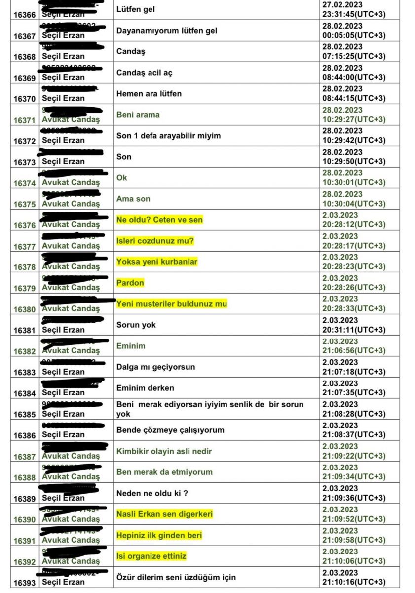 Candaş Gürol’un mesajlaşmaların son bölümlerinde Erzan’a herkesi dolandırdığı için kızdığına dair mesajlar yer aldı.