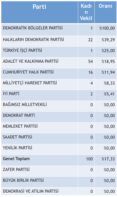 Keza, TBMM’nin kadınlara tanıdığı siyaset hakkı sınırlıdır. 27. Yasama Yılının sandalye dağılımı dikkate alındığında TBMM’de;