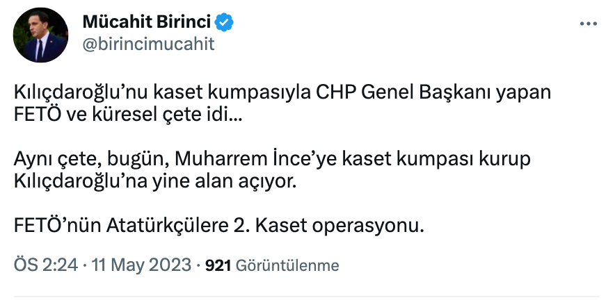 Birinci Twitter hesabından yaptığı paylaşımda, “Kılıçdaroğlu’nu kaset kumpasıyla CHP Genel Başkanı yapan FETÖ ve küresel çete idi... Aynı çete, bugün, Muharrem İnce’ye kaset kumpası kurup Kılıçdaroğlu’na yine alan açıyor.  FETÖ’nün Atatürkçülere 2. Kaset operasyonu.” yorumunu yaptı.