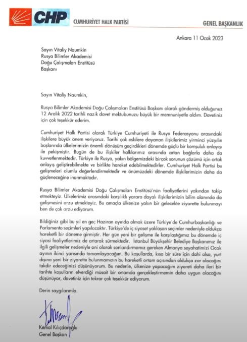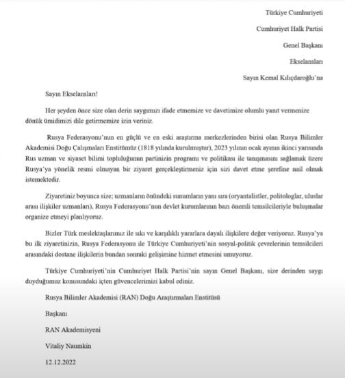 Altaylı'nın paylaştığı Rus Bilimler Akademisi akademisyeni Vitaliy Naumkin imzalı davetin Türkçe tercümesinde, "RAN, 2023 yılının Ocak ayının ikinci yarısında Rus uzman ve siyaset bilimi topluluğunun partinizin programı ve politikası ile tanışmasını sağlamak üzere Rusya'ya resmi olmayan bir ziyaret gerçekleştirmeniz için sizi davet etme şerefine nail olmak istemektedir" ifadeleri yer alıyor. Bu mektupta ise Putin'le bir görüşmeye dair bilgi bulunmuyor.