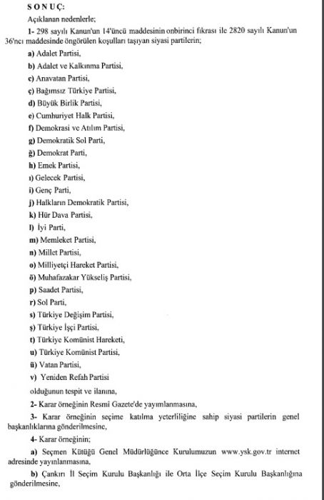 Resmî Gazete’de yayınlanan YSK kararına göre, Adalet Partisi, Memleket Partisi ve Türkiye Değişim Partisi’nin seçime girme yeterliliğine sahip. Ümit Özdağ'ın Genel Başkanı olduğu Zafer Partisi ise listede yer almadı.