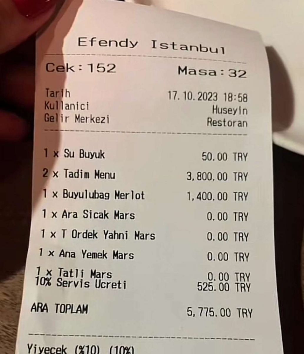 Paylaşılan adisyona göre hesap 5 bin 775 TL tuttu. Öte yandan adisyonda servis ücretinin 525 TL yazıldığı görüldü.