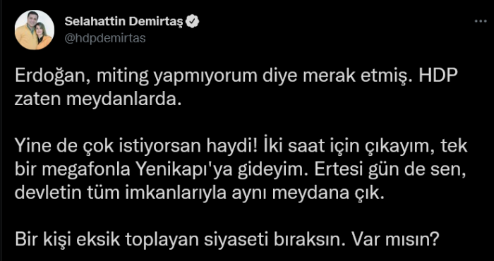 Katar ziyareti dönüşünde (8 Aralık 2021) gazetecilerin sorularını cevaplayan Cumhurbaşkanı Recep Tayyip Erdoğan, cezaevinde tutuklu bulunan eski HDP eş Genel Başkanı Selahattin Demirtaş'ın muhalefetin ortak miting yapması yönündeki çağrısı hakkında açıklamalarda bulundu. Cumhurbaşkanı Erdoğan, "Bunu söyleyeceğine sen bir tane miting yap bakalım orada. Sen önce kendi tabanına bir sinyal ver bakalım. Senin tabanının şu anda miting yapacak mecali kaldı mı?" dedi.
