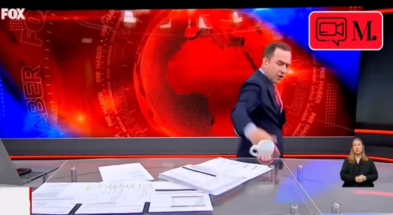 Tepeli, rejiye diğer habere geçmesi gerektiğini söylerken masada duran bardağı ve kalemi kameraya doğru fırlattı.