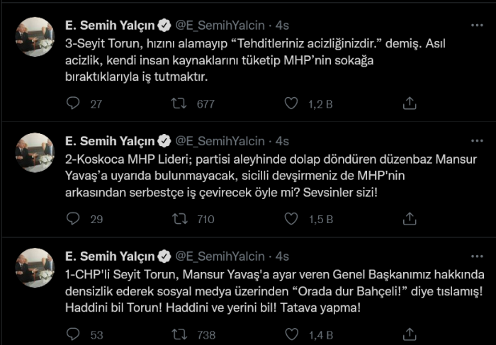 3-Seyit Torun, hızını alamayıp “Tehditleriniz acizliğinizdir.” demiş. Asıl acizlik, kendi insan kaynaklarını tüketip MHP’nin sokağa