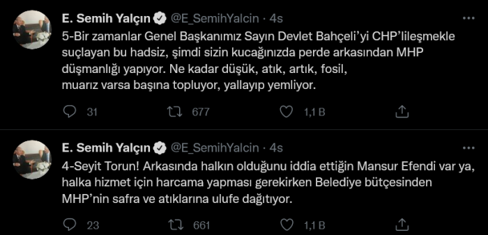 Semih Yalçın, Yavaş'ın MHP aleyhinde çalıştığını iddia ederek hakkında "düzenbaz" ifadesi kullandı. Yalçın ayrıca İYİ Parti Lideri Meral Akşener için de sert ifadeler kullandı. Son olarak Yalçın, Yavaş'ın "rahat durması" gerektiğini ve Bahçeli'nin "ikazlarını" dikkate alması gerektiğini söyledi.
