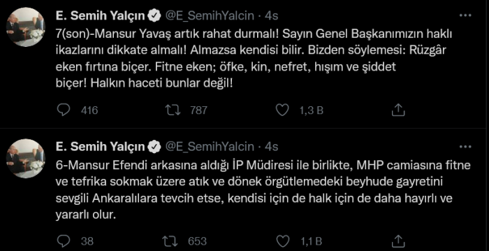 7(son)-Mansur Yavaş artık rahat durmalı! Sayın Genel Başkanımızın haklı ikazlarını dikkate almalı! Almazsa kendisi bilir. Bizden söylemesi: Rüzgâr eken fırtına biçer. Fitne eken; öfke, kin, nefret, hışım ve şiddet