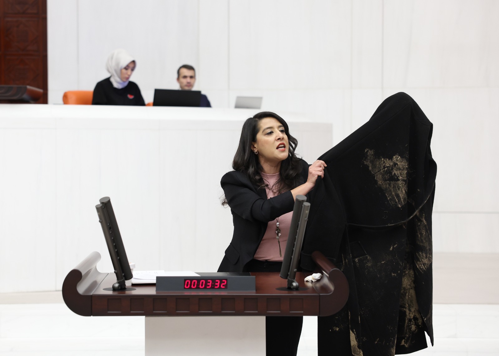 Şanlıurfa’da 27 gündür direnen ve her türlü şiddete maruz kalan Özak Tekstil işçilerinin direnişinde EMEP Milletvekili İskender Bayhan’la birlikte gaz ve tazyikli suya maruz kalan Karaca, saldırı sırasında üzerinde olan çamurlu montu genel kurulda AKP’li vekillere göstererek “Alın bakın, insan gibi yaşamak için 27 gündür direnen Özak işçilerine reva gördüğünüz barbarlığı gösteriyor bu palto. İşçiler ekmeğinin, anayasal sendika değiştirme hakkının peşindeyken, onlara destek olan milletvekillerinin yerlerde sürüklenmesinin nişanesi olarak, size utanç vesikası olarak getirdim. ‘Haklar, özgürlükler, demokrasi’ diye nutuk atacağınız konuşmalarda sırtınıza geçirirsiniz artık. Üstünde Meclis bahçesinde tüttürdüğünüz mangalın kokusu yok AKP vekilleri, valilik emriyle sıktırdığınız biber gazı kokusu var. Siz bilmezsiniz…” diye seslendi.