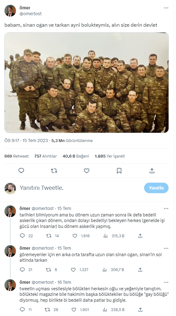 Sinan Oğan’ın bedelli askerlik yaptığı döneme ait olduğu iddia edilen fotoğraf sosyal medyada oldukça konuşuldu. Bir Twitter kullanıcısı babasının askerlik fotoğrafı paylaşarak “Babam, Sinan Oğan ve Tarkan aynı bölükteymiş” notunu düştü. Kullanıcılar ise gözlerine inanamadı. ‘Sinan Oğan bedelli askerlik yapmış’ tartışmaları sosyal medyada gündem oldu.