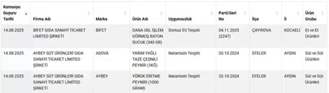 Bakanlığın yaptığı denetimlerde, Bifet markalı sucukta ikinci kez domuz eti, Asova ve Aybey markalı peynirlerde ise yasaklı koruyucu madde olan natamisin tespit edildi.