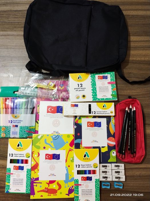 Görsellerin içeriğinde kuru boya, pastel boya, kurşun kalem, kalemtraş gibi kırtasiye malzemeleri yer almakta ve üzerlerinde ‘Suriyeli Çocukların Türk Eğitim Sistemine Entegrasyonunun Desteklenmesi Projesi’ ifadesi bulunmaktaydı.
