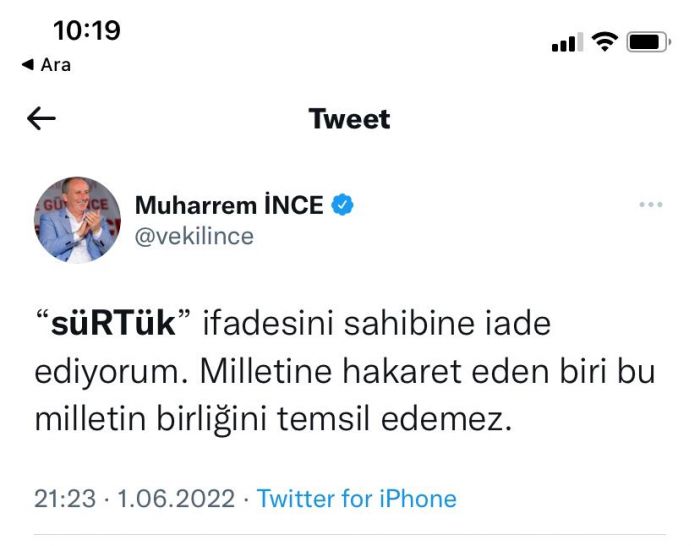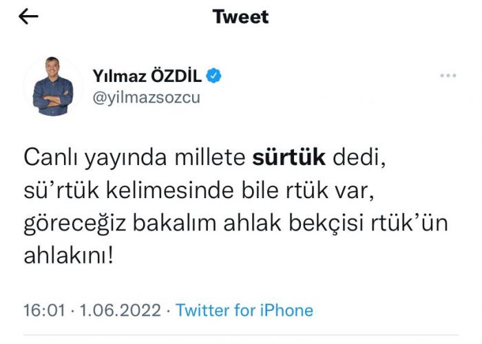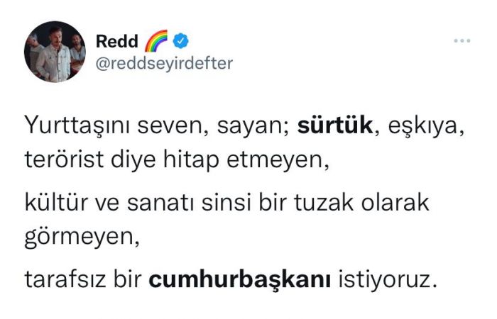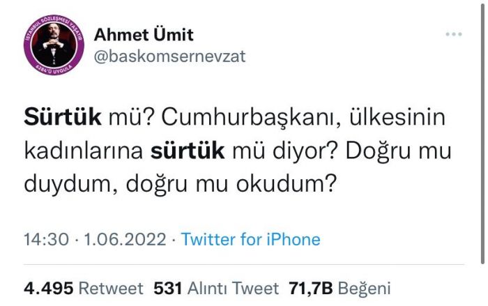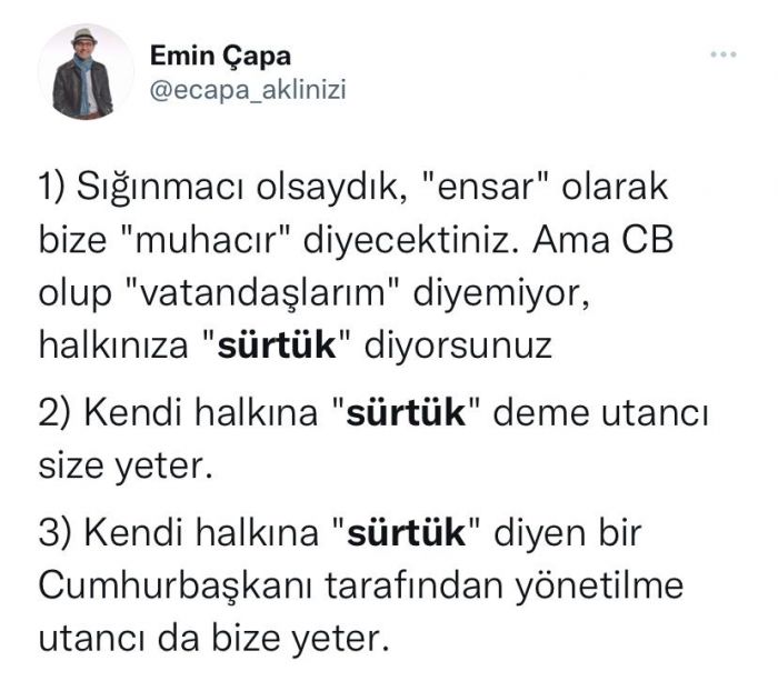 Bu açıklama sonrası ‘#sürtük’ etiketi Twitter’da hızla birinci sıraya yükseldi, diğer sosyal medya platformalarından da konuya ilişkin çokça eleştiri paylaşımı yapıldı. Cumhurbaşkanına kullandığı tabir nedeniyle sanat, siyaset, medya camiası başta olmak üzere bir çok kesimden tepki geldi. İşte o paylaşımlardan bazıları;
