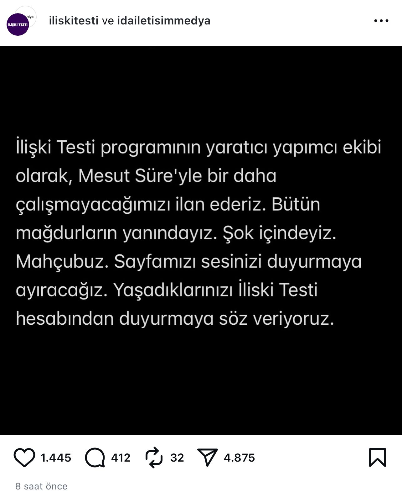 Öte yandan, İlişki Testi programının yapımcı ekibi İda İletişim, hakkında taciz iddiaları çıkan Mesut Süre ile artık çalışmayacaklarını duyurdu.