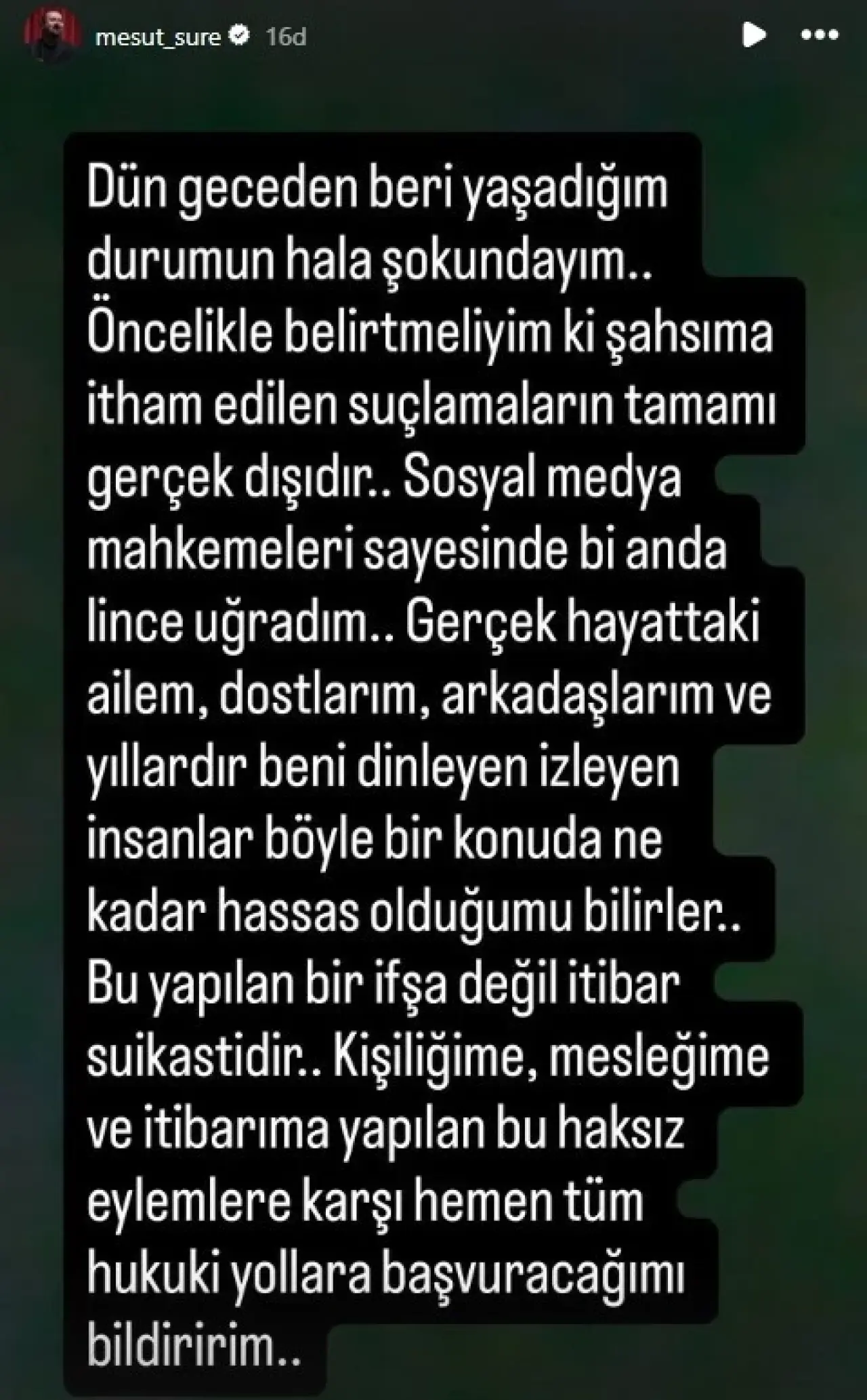 Taciz iddiaları hakkında sosyal medya sayfası üzerinden açıklama yapan Mesut Süre, şu ifadeleri kullandı: