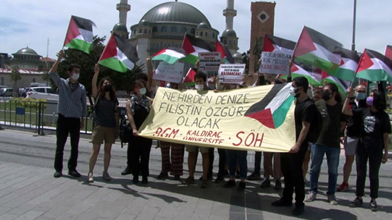 Taksim Meydanı'nda "Nehirden denize Filistin özgür olacak" yazılı pankart açıp Filistin bayrakları taşıyan grup sloganlar atıp İsrail'i protesto etti.