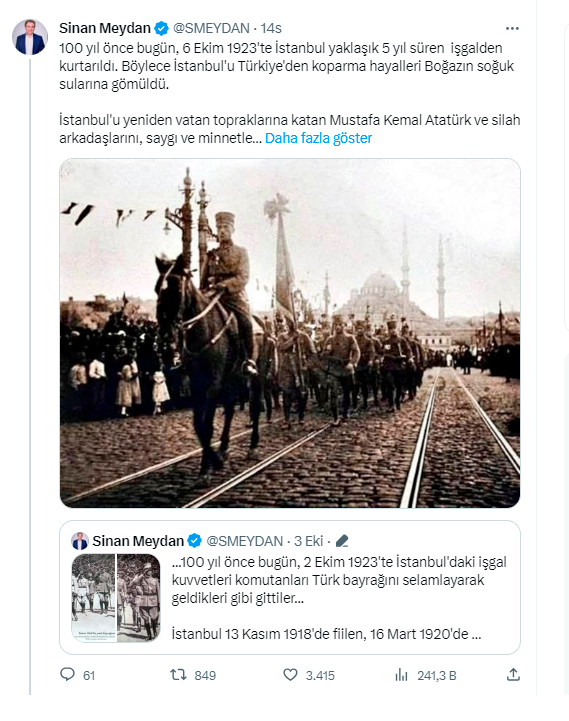 Ünlü tarihçi Sinan Meydan 6 Ekim İstanbul’un Kurtuluşu dolayısıyla sosyal medya hesabından bir paylaşımda bulunmuştu.