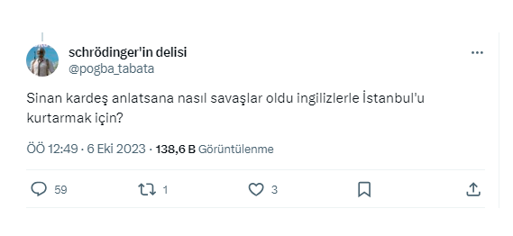 Bir kullanıcı bu paylaşımla dalga geçmek ve İstanbul’un savaşarak kurtarılmadığını ima etmek amacıyla, “Sinan kardeş anlatsana nasıl savaşlar oldu ingilizlerle İstanbul'u kurtarmak için?” şeklinde yorumda bulundu.
