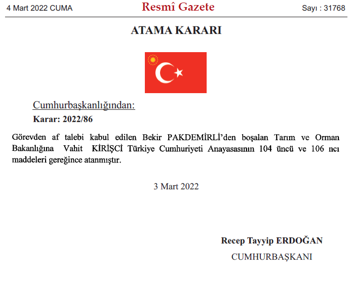 4 Mart 2022 tarihli Resmi Gazete'ye göre Tarım ve Orman Bakanı Bekir Pakdemirli istifa etti. Pakdemirli'nin görevine Vahit Kirişçi atandı. Cumhurbaşkanı Recep Tayyip Erdoğan'ın imzasıyla yayımlanan karar şöyle: