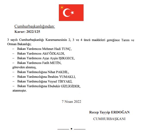 Resmi Gazete'de yayımlanan AKP'li Cumhurbaşkanı Recep Tayyip Erdoğan'ın kararına göre, Tarım ve Orman Bakanlığı'nda bakan yardımcıları Mehmet Hadi Tunç, Akif Özkaldı, Ayşe Ayşin Işıkgece ve Fatih Metin görevden alındı.