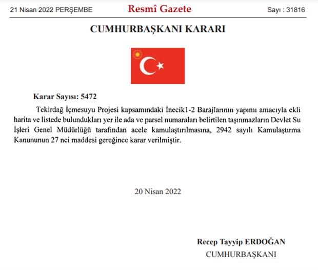 Tekirdağ İçme Suyu Projesi kapsamındaki İnecik 1 ve 2 barajlarının yapımı amacıyla 24 taşınmaz için acele kamulaştırma kararı verildi.