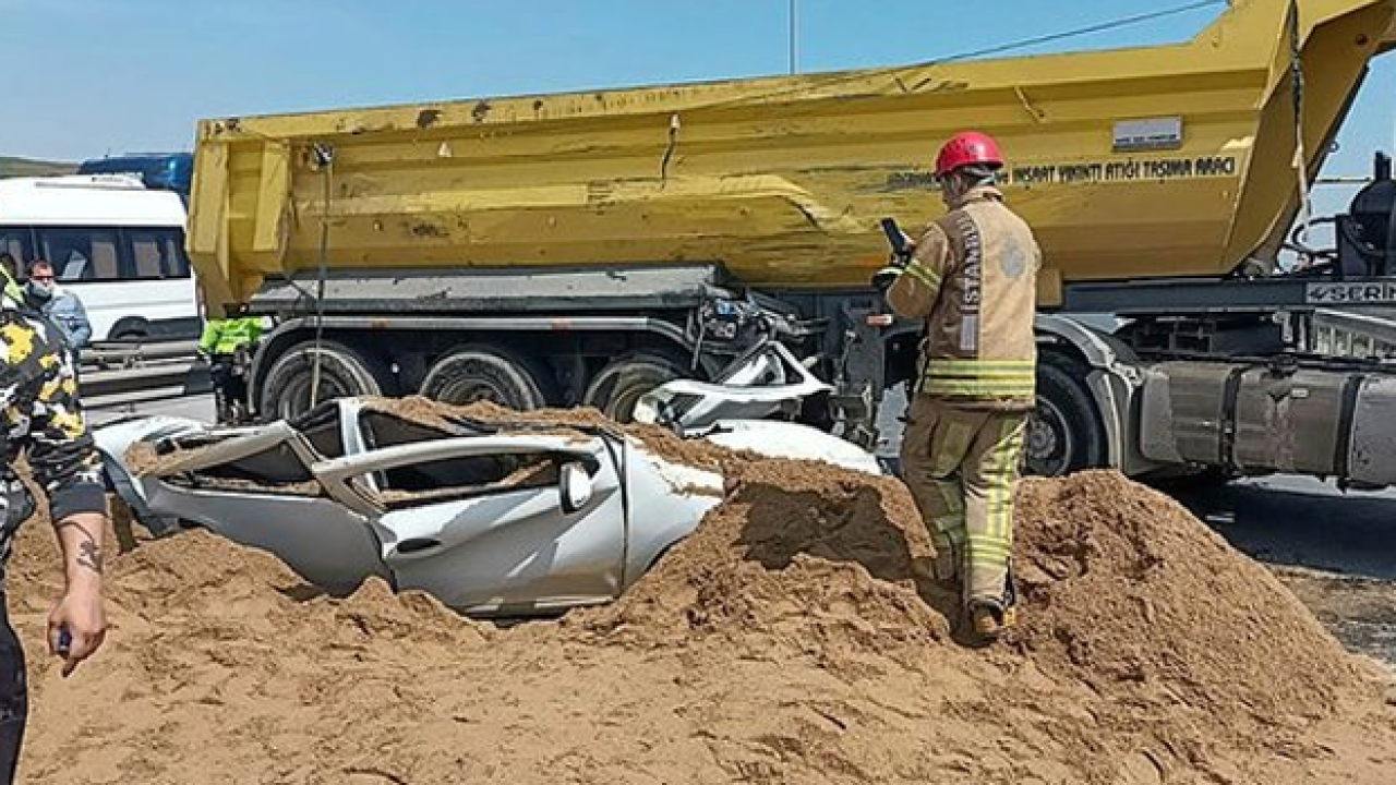 Tem Otoyolu Kumburgaz mevkii Ankara istikametinde kum yüklü TIR bir otomobilin üstüne devrildi. Olay yerine çok sayıda itfaiye ekibi sevk edildi. TIR'ın dorsesinin altında kalan otomobilin sürücüsünü kurtarma çalışmaları başladı. Vatandaşlar ve itfaiye ekipleri dorsedeki kumu küreklerle boşalttıktan sonra, dorse aracın üzerinden kaldırıldı.