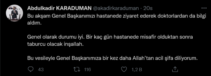 Bu vesileyle Genel Başkanımıza bir kez daha Allah’tan acil şifa diliyorum.