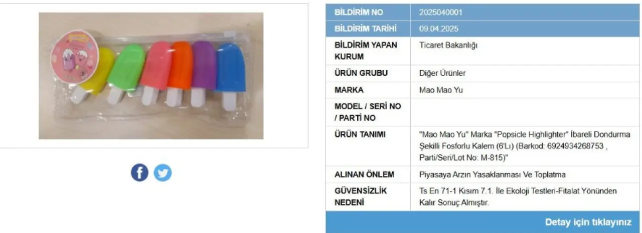 Çin'de üretilen ve Türkiye’de “Mao Mao Yu” markasıyla satılan, üzerinde "Popsicle Highlighter" ibaresi bulunan dondurma şeklindeki altılı fosforlu kalem, hem kimyasal bileşenleri hem de fiziksel yapısı nedeniyle çocuk sağlığı açısından ciddi riskler taşıyor.