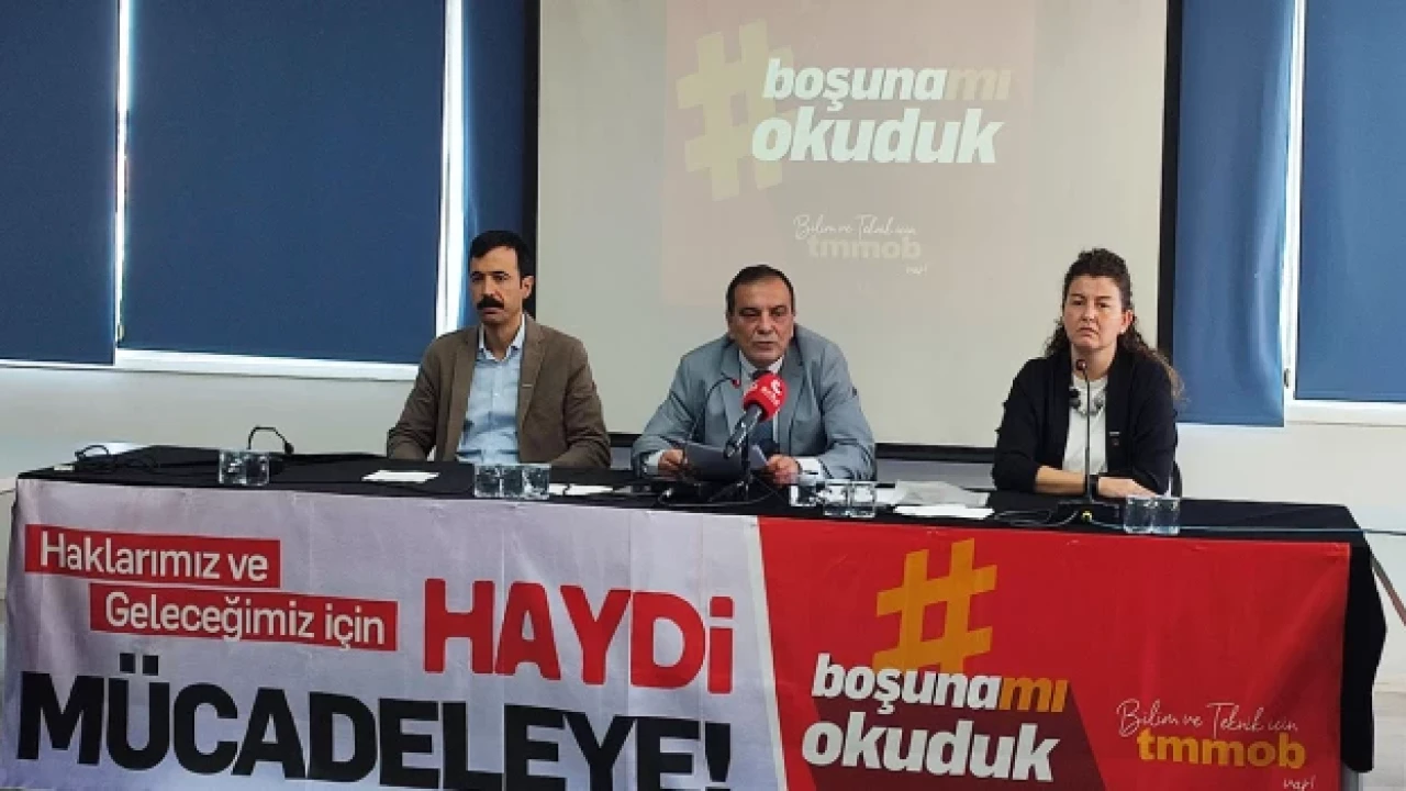 “Mühendis, mimar ve şehir plancısı adayı pek çok genç, ülkemizin geleceğine dair umutlarını kaybetmek üzeredir. İşsizlik oranı yüzde 40’ları aşmıştır. Yeni mezun meslektaşlarımızın iş bulma süreleri 18 aya kadar uzamıştır. Çok sayıda meslektaşımız iş bulamadığı için yurt dışına çıkmaktadır. Ülkemiz, yetişmiş değerli mühendis, mimar ve şehir plancılarını kaybetmektedir. Meslektaşlarımız yoğun işsizlik sonucu geçimlerini sağlayabilmek için meslek dışı işlere yönelmekte, tezgâhtarlık, garsonluk, kuryelik gibi işlerde çalışmaktadır. Bu acı tablo bizlere kaybedilmekte olan bir geleceği işaret etmektedir. Yüzbinlerce mühendis, mimar ve şehir plancısının bilincinde ’boşuna mı okuduk’ sorusu belirginleşmektedir.